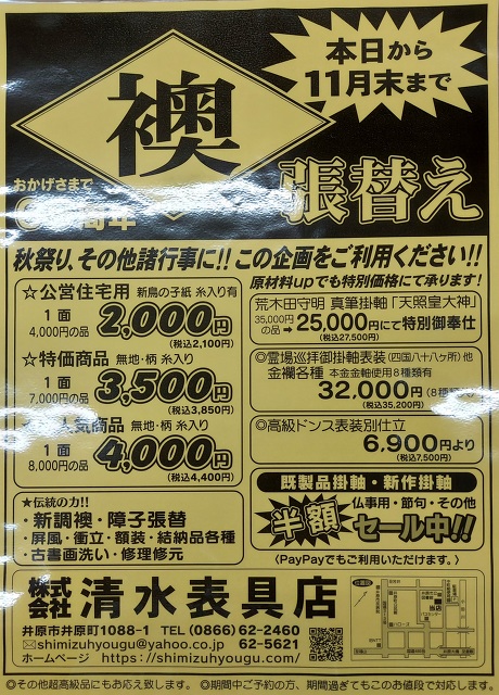 お知らせ - 岡山県井原市の表具・襖・障子・結納 リフォーム『(株)清水表具店』(岡山県井原市井原町)