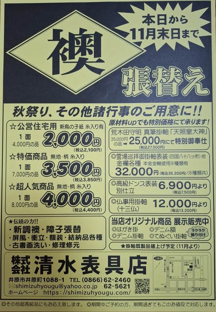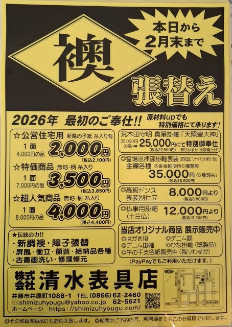 岡山県井原市の表具・襖・障子・結納 リフォーム『(株)清水表具店』 へようこそ