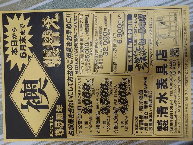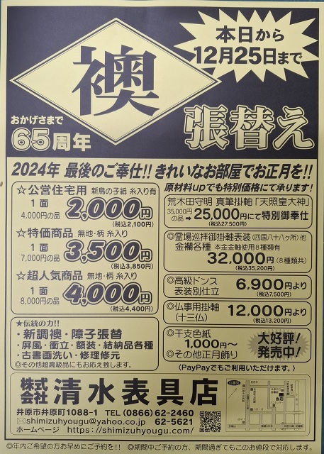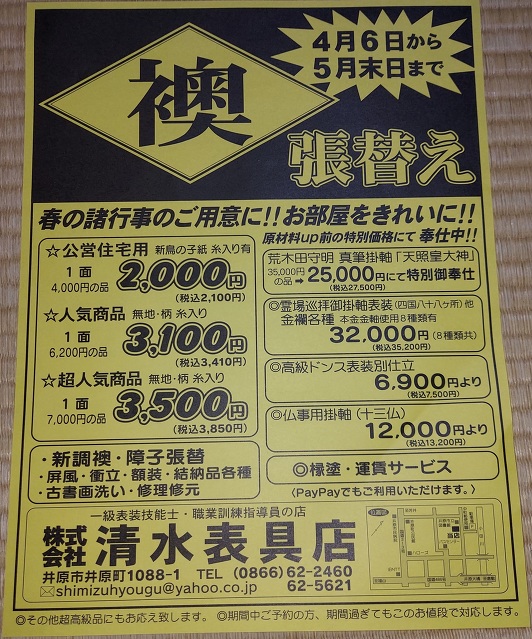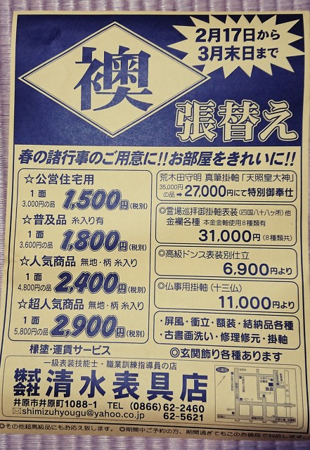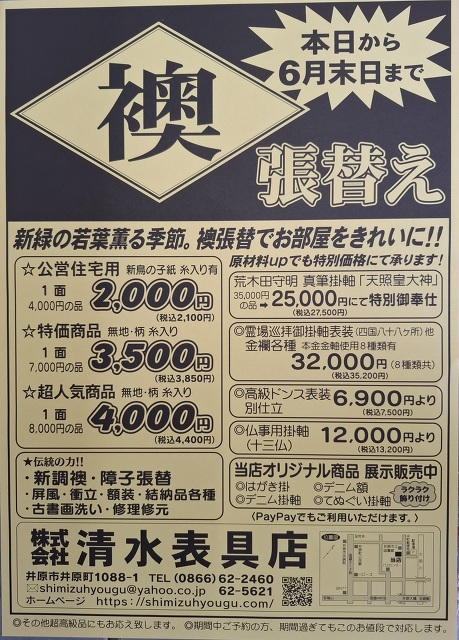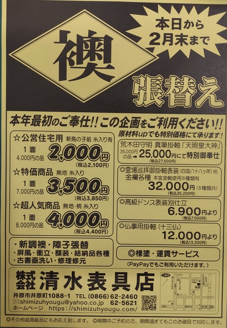 お知らせ - 岡山県井原市の表具・襖・障子・結納 リフォーム『(株)清水表具店』(岡山県井原市井原町)