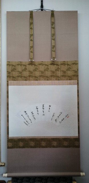 裂けてボロボロになっていた扇子を、 掛け軸表装していただきました。 新品のように本紙が明るくなり、 掛け軸と一体化し、 素敵な作品になりました。 家宝にします。 とのことでした。